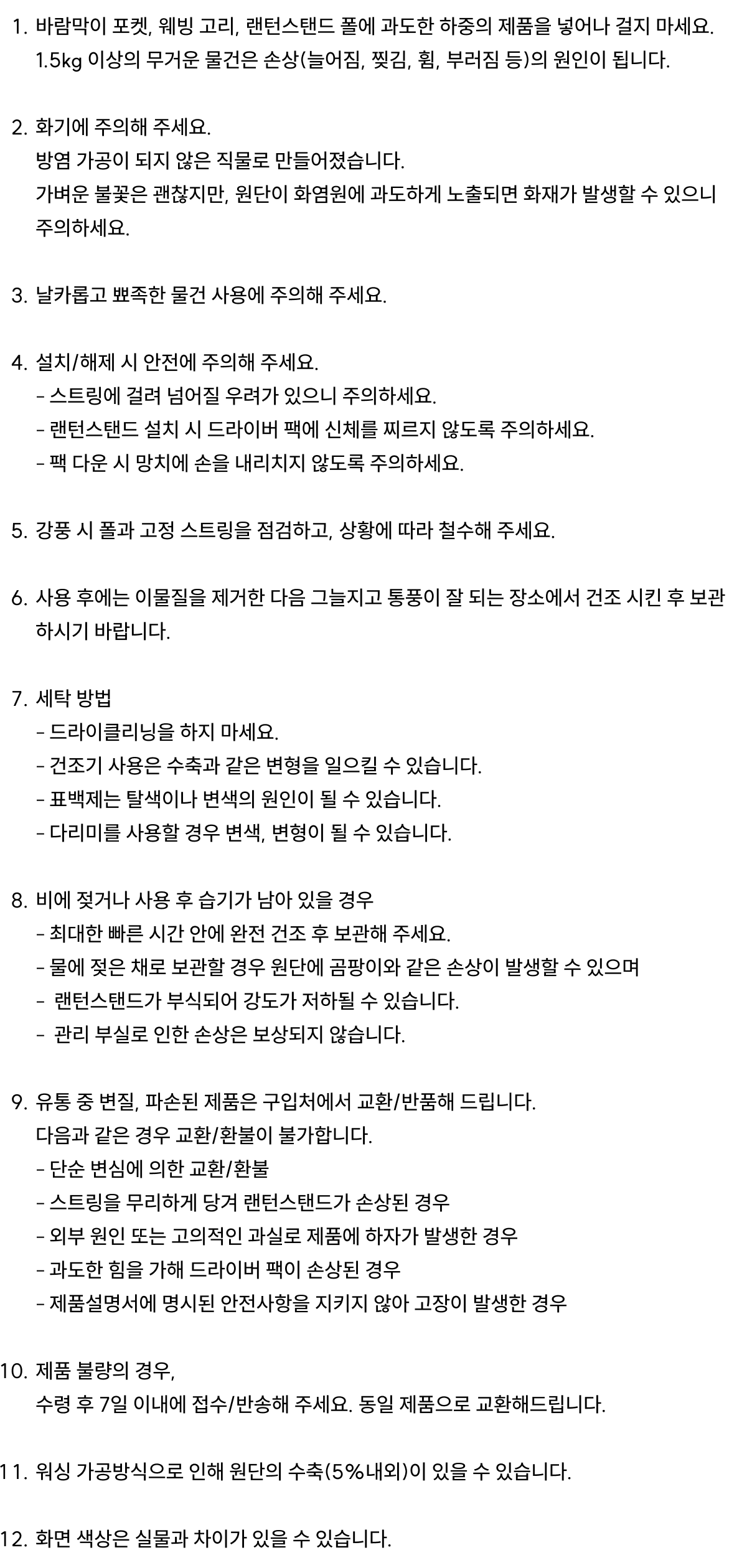 무게: 바람막이 원단 (1kg) / 랜턴스탠드 (0.7kg)
